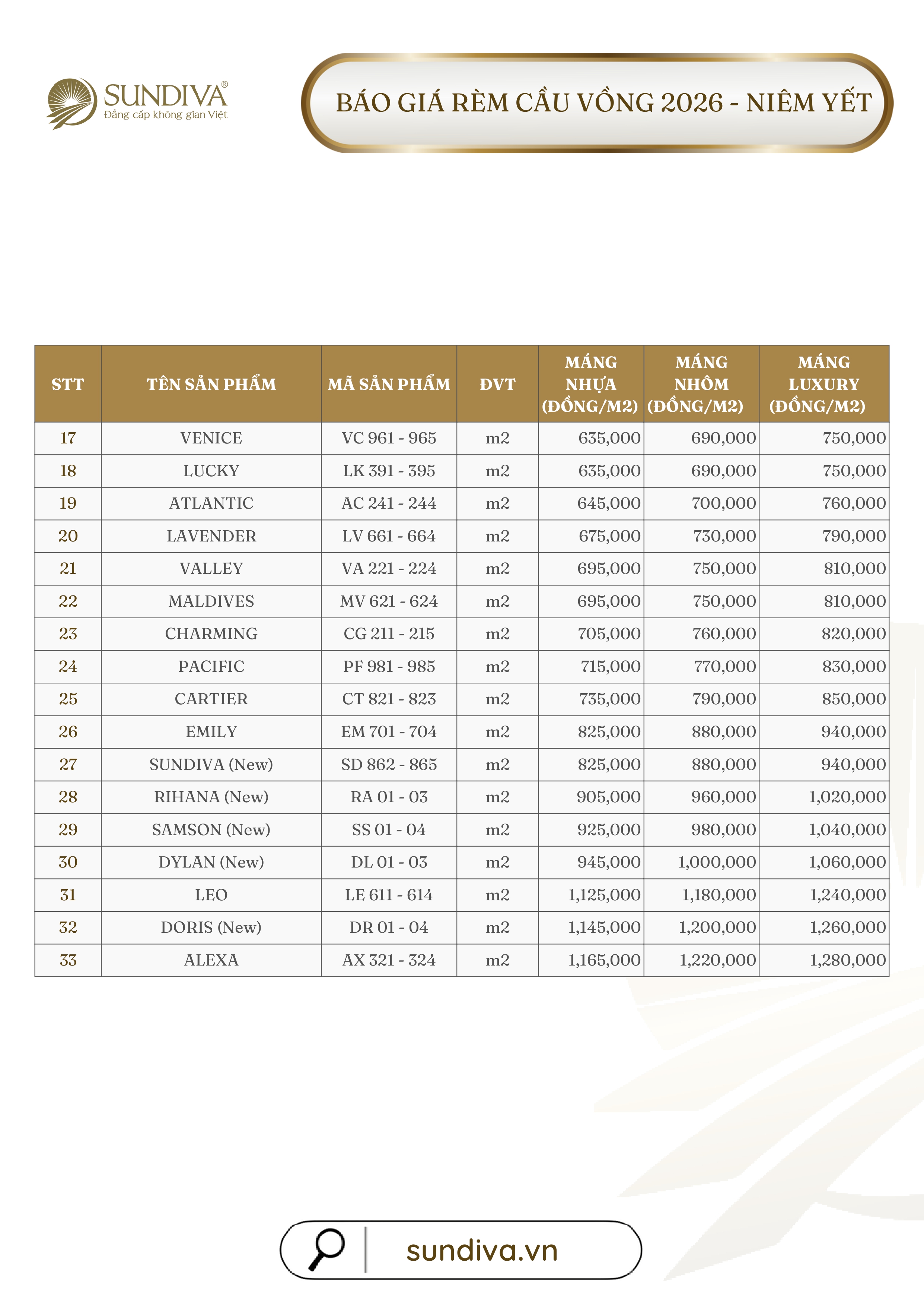 Lời đầu tiên, Công ty Cổ Phần Transimex Việt Nam xin gửi lời cảm ơn chân thành đến Quý khách hàng đã ủng hộ sản phẩm của chúng tôi trong suốt thời gian vừa qua. Nhân dịp ra mắt bộ sưu tập mới, thương hiệu mới. Công ty chúng tôi xin gửi tới Quý khách hàng bảng giá rèm cầu vồng Sundiva năm 2026, cụ thể như sau: